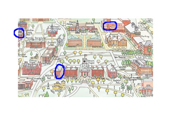 Valentine Dining Hall, Merrill Science Center and Williston Hall. |